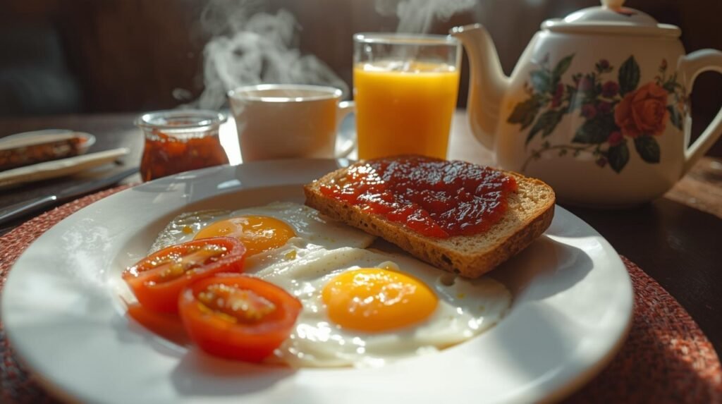 Ham, Sausage, Sautéed Potatos, Grill Tomato, Whole wheat bread, Jam, Butter, Orange Juice, Tea/Coffee